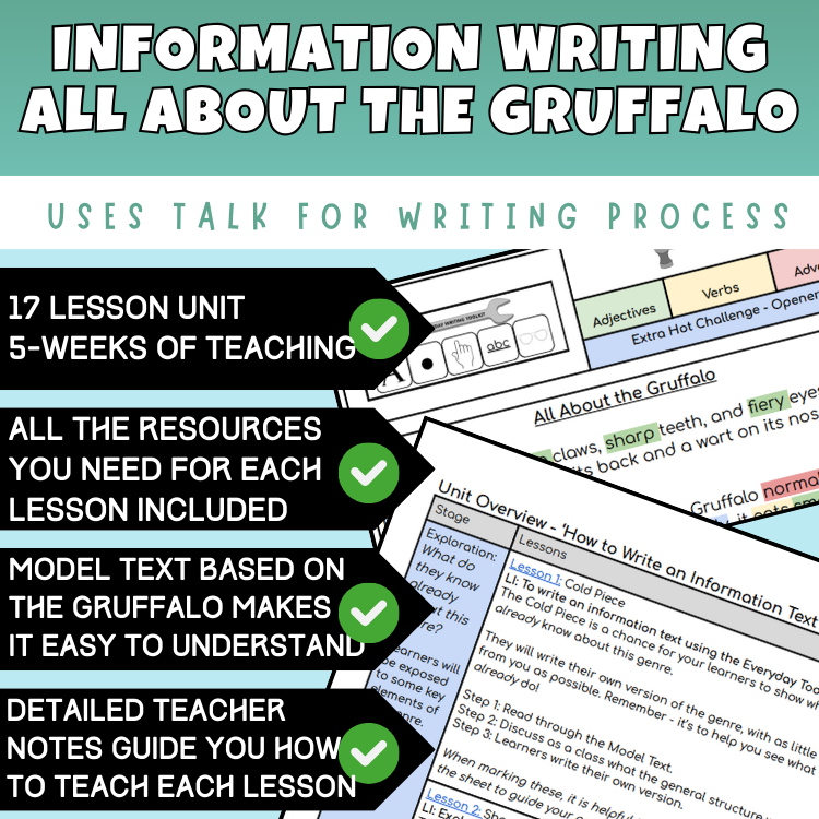 This 5-week, 17 lesson writing unit uses the story of The Gruffalo and teaches your learners how to turn this into an original Information text.